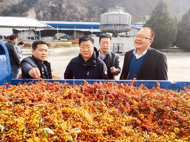 沙棘苗就是山里人的金鳳凰。2019年,邱軍聯(lián)系中國化學(xué)工程集團(tuán)投入138萬元,育沙棘苗620萬株,實現(xiàn)44戶貧困戶年穩(wěn)定增收15000元以上。如今的甘肅華池,一箱箱包裝精美的沙棘汁從現(xiàn)代化車間運出,銷往全國。圖為2020年10月4日,邱軍(右一)在甘農(nóng)科技調(diào)研沙棘收購情況?!≈袊瘜W(xué)工程集團(tuán)有限公司供圖