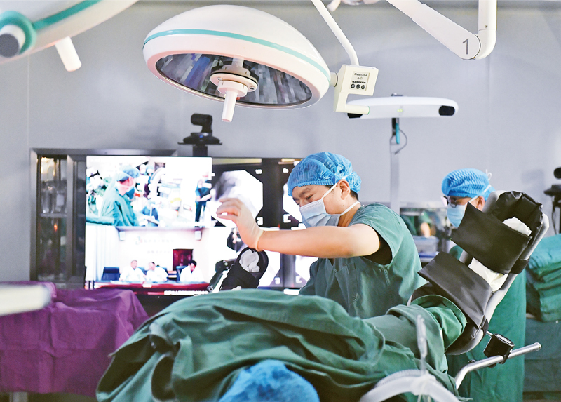 數(shù)字技術(shù)與醫(yī)療、農(nóng)業(yè)、能源、建筑、服務(wù)業(yè)等緊密結(jié)合,正在推動(dòng)傳統(tǒng)產(chǎn)業(yè)日益高端化、智能化。圖為2021年4月19日,拉薩市人民醫(yī)院骨科醫(yī)生在北京積水潭醫(yī)院專家遠(yuǎn)程指導(dǎo)下,使用骨科機(jī)器人開(kāi)展骨科手術(shù)。 新華社記者 孫瑞博 /攝