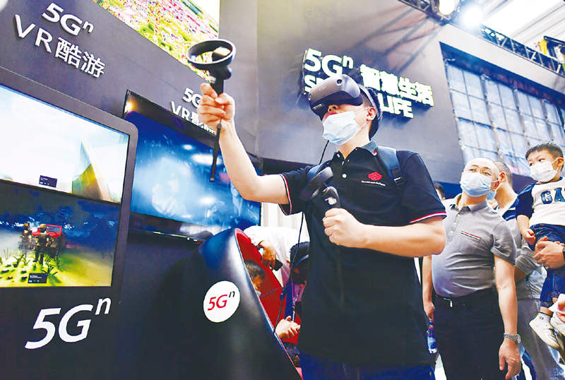 產(chǎn)業(yè)數(shù)字化和數(shù)字產(chǎn)業(yè)化是推動數(shù)字經(jīng)濟與實體經(jīng)濟深度融合的具體表現(xiàn)。圖為2021年10月14日,參觀者在第三屆數(shù)字中國建設成果展覽會上體驗5GnVR酷游。 中新社記者 張斌/攝