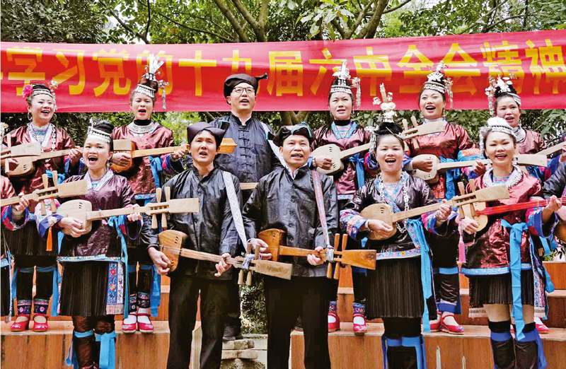 近期,全國各地圍繞學(xué)習(xí)宣傳貫徹黨的十九屆六中全會精神組織開展形式多樣、內(nèi)涵豐富的文化文藝活動。圖為2021年12月12日,廣西柳州市融水苗族自治縣組織駐村工作隊員和民間歌手等以侗族琵琶歌形式宣講全會精神?!∪嗣褚曈X 龍濤/攝