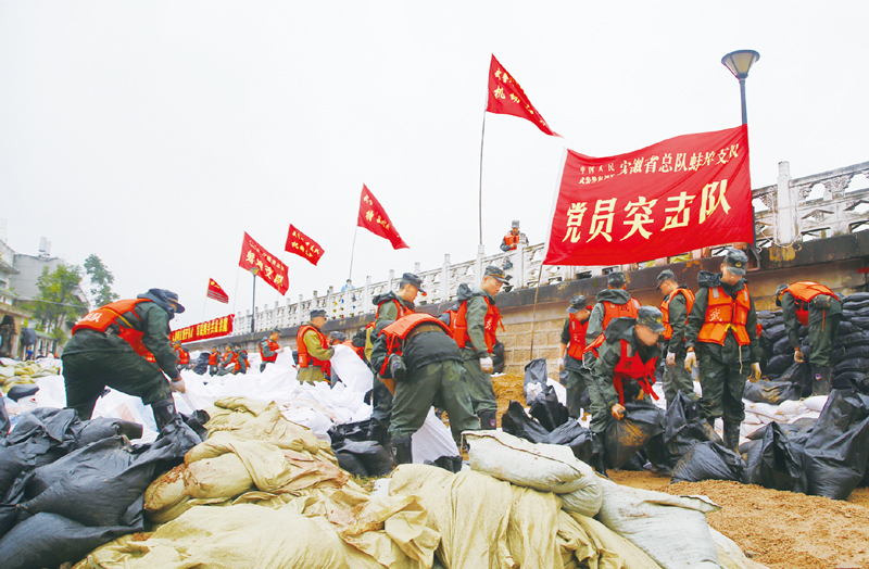 對(duì)黨忠誠(chéng)、聽(tīng)黨指揮、為黨盡責(zé),各級(jí)黨組織充分發(fā)揮戰(zhàn)斗堡壘作用。圖為2020年7月16日,武警安徽總隊(duì)蚌埠支隊(duì)125名黨員組成突擊隊(duì)在銅陵市樅陽(yáng)縣長(zhǎng)河上碼頭搶運(yùn)沙袋,加固堤壩?!⌒氯A社發(fā) 李程輝/攝