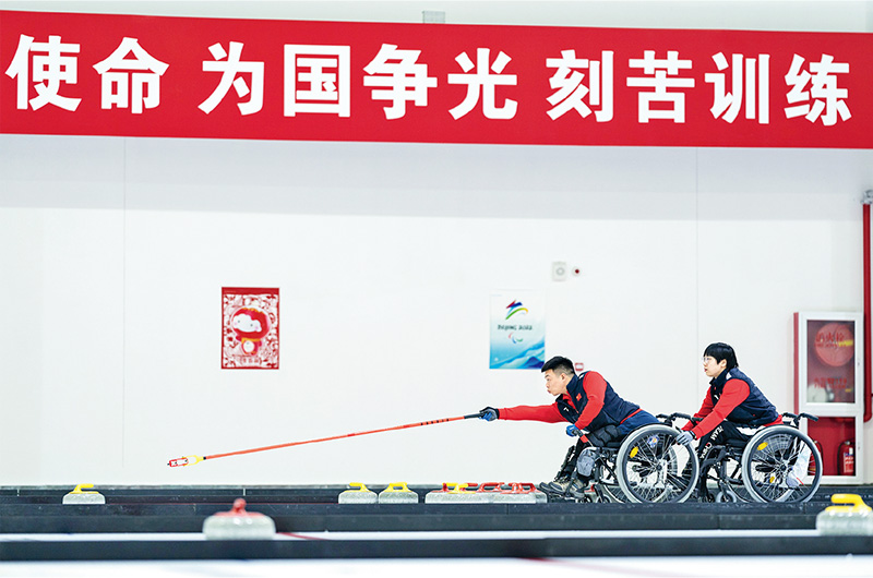北京2022年冬殘奧會將于3月4日開幕。這是2021年12月23日,在位于北京順義的國家殘疾人冰上運動比賽訓(xùn)練館,中國輪椅冰壺隊隊員抓緊進行訓(xùn)練,為北京冬殘奧會做最后的準(zhǔn)備。 新華社記者 才揚/攝