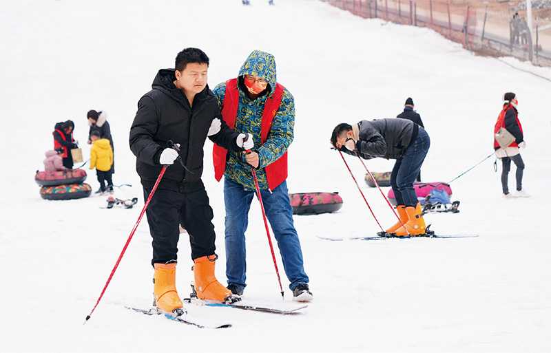 2022年2月18日,以“擁抱冬殘奧,熱情迎嘉賓”為主題的第六屆全國殘疾人冰雪運動季示范活動(河南站),在河南滎陽九龍口滑雪場舉行。百余名盲人和志愿者參加活動,體驗雪地拔河、雙板滑雪、雪地車等冰雪項目。這是一位盲人在志愿者幫助下體驗滑雪運動。 視覺中國 馬健/攝