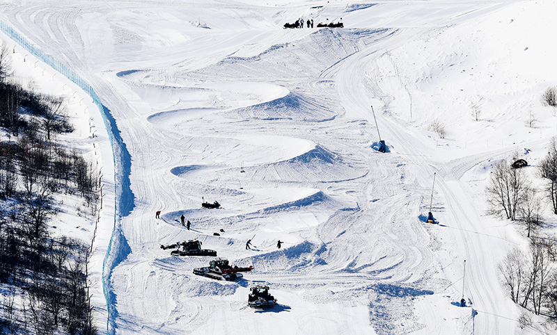 2022年2月23日,北京冬奧會剛剛落下帷幕,河北張家口賽區(qū)云頂場館群迅速進入冬殘奧會轉(zhuǎn)換期,賽道二次塑型、張貼冬殘奧標(biāo)識、殘奧景觀布設(shè)等工作全面展開,備戰(zhàn)即將到來的北京冬殘奧會。這是工作人員在云頂滑雪公園進行賽道二次塑型作業(yè)。 視覺中國 武殿森/攝