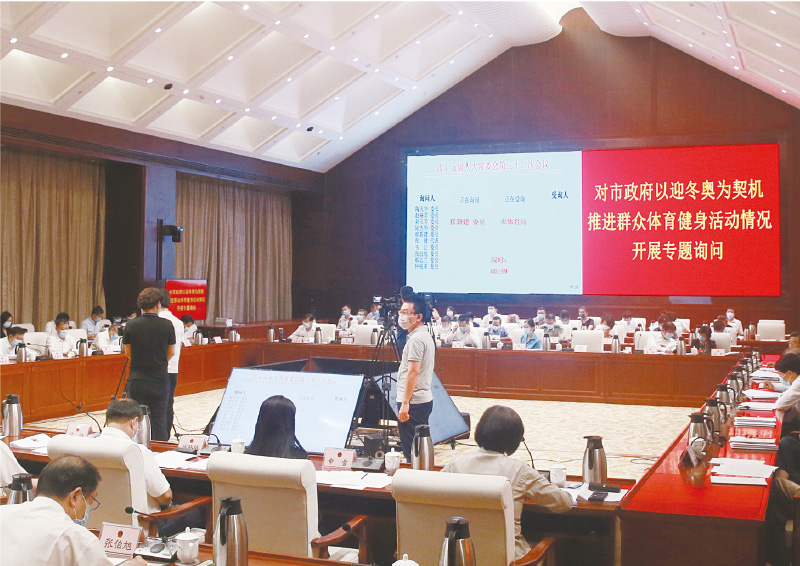圖為2021年7月30日,北京市第十五屆人大常委會(huì)第三十二次會(huì)議召開,對市政府以迎冬奧為契機(jī)推進(jìn)群眾體育健身活動(dòng)情況開展專題詢問。 北京市人大常委會(huì)供圖 薛睿杰/攝