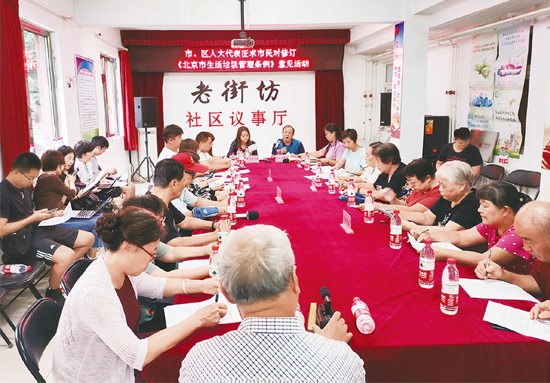 圖為2019年8月20日,北京市、區(qū)人大代表圍繞修訂《北京市生活垃圾管理?xiàng)l例》,在石景山區(qū)蘋果園街道蘋四社區(qū)代表聯(lián)絡(luò)站同群眾當(dāng)面交流。 北京市石景山區(qū)人大常委會(huì)供圖
