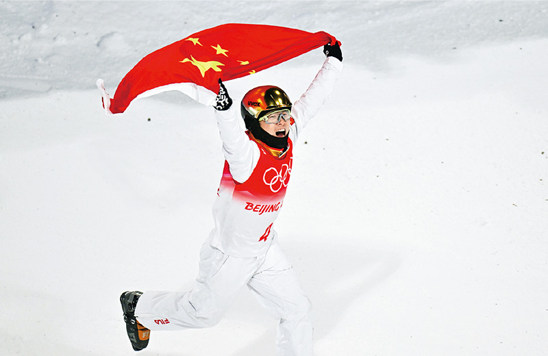 圖為2022年2月16日,中國選手齊廣璞慶祝奪冠。當(dāng)日,北京2022年冬奧會自由式滑雪男子空中技巧決賽在張家口賽區(qū)舉行,中國選手齊廣璞獲得冠軍。 新華社記者 肖藝九/攝