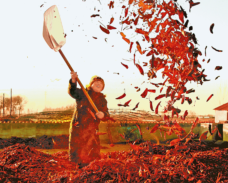 內(nèi)蒙古通遼市開魯縣紅干椒種植面積達到60萬畝,僅此一項就帶動全縣農(nóng)牧民年人均增收3000元以上。圖為當?shù)匾晃晦r(nóng)民正在晾曬紅干椒?!?nèi)蒙古日報社供圖
