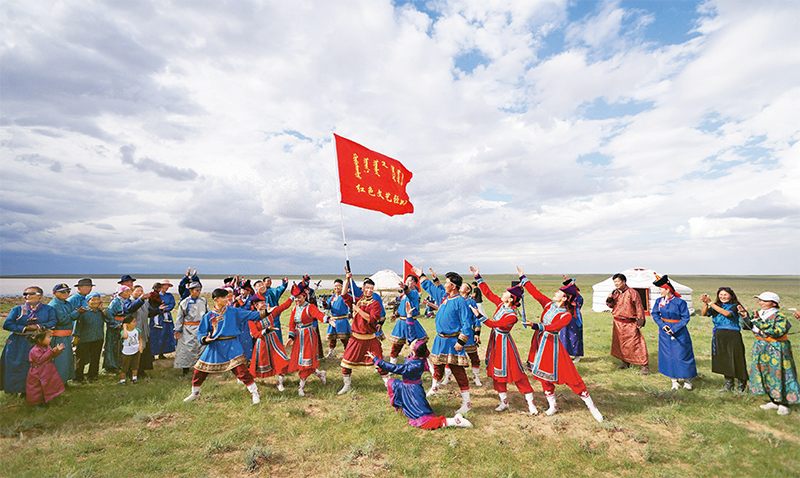 烏蘭牧騎的蒙古語原意是“紅色的嫩芽”,后被引申為“紅色文藝輕騎兵”,是適應草原地區(qū)生產(chǎn)生活特點而誕生的文化工作隊,具有“演出、宣傳、輔導、服務”等職能,深受廣大農(nóng)牧民歡迎。圖為內(nèi)蒙古蘇尼特右旗烏蘭牧騎隊員在牧區(qū)演出。 新華社發(fā) 東哈達/攝