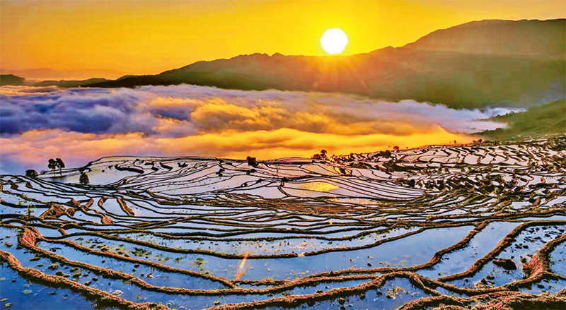 2022年2月13日,陽光灑在梯田上,倒映出田間迷人的畫卷,猶如人間仙境。圖為紅河縣寶華鎮(zhèn)至甲寅鎮(zhèn)沿途楊柳梯田風(fēng)光?!〖t河州委宣傳部供圖 陸光漢/攝
