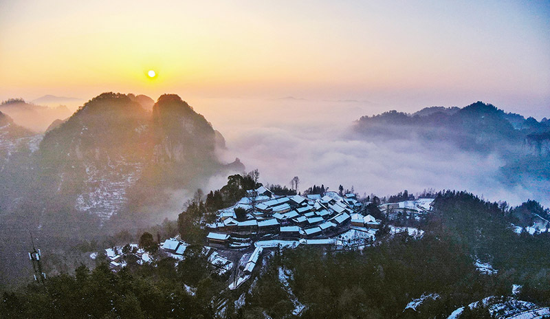 日出美如畫。圖為2022年2月24日拍攝的湖南省湘西土家族苗族自治州花垣縣雙龍鎮(zhèn)十八洞村雪后日出。 新華社發(fā) 龍恩澤/攝