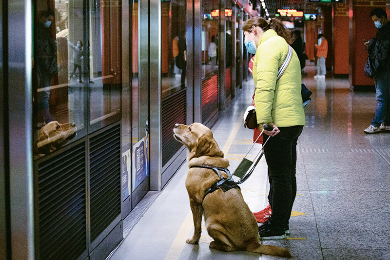 近年來,我國(guó)城鄉(xiāng)無障礙環(huán)境不斷優(yōu)化,殘疾人日常出行、信息交流更加便利。圖為2021年3月13日,江蘇南京一名視力殘疾人在導(dǎo)盲犬的陪伴下乘坐地鐵出行。 新華社發(fā) 張夢(mèng)/攝
