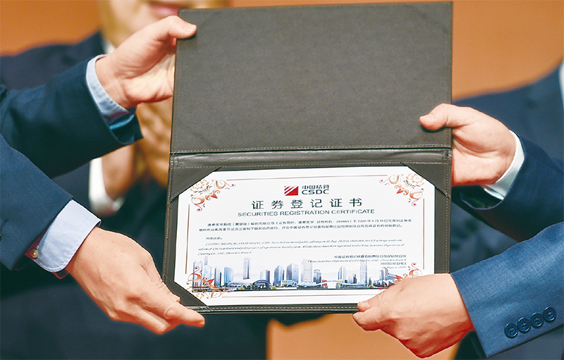 2019年以來,我國科創(chuàng)板、創(chuàng)業(yè)板試點注冊制相繼成功落地,大大提升了資本市場對優(yōu)質(zhì)企業(yè)的吸引力。圖為2020年8月24日,在深圳證券交易所舉行的創(chuàng)業(yè)板改革并試點注冊制首批企業(yè)上市儀式上,上市企業(yè)收取證券登記證書。 新華社記者 毛思倩/攝
