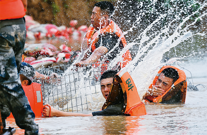 圖為2021年7月22日,在河南省開封市賈魯河小崗凹河段,空降兵某旅官兵跳入齊胸深的洪水中加固堤壩。 新華社發(fā) 余紅春/攝