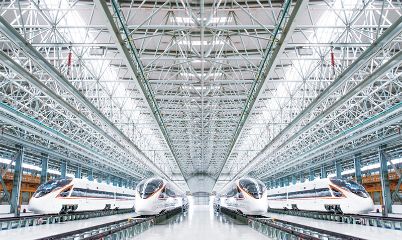 中國(guó)中車(chē)在研制時(shí)速350公里的“復(fù)興號(hào)”動(dòng)車(chē)組過(guò)程中,堅(jiān)持以我為主開(kāi)展技術(shù)攻關(guān),全面掌握動(dòng)車(chē)組關(guān)鍵核心技術(shù),軟件、硬件全部實(shí)現(xiàn)自主設(shè)計(jì)、制造或選型,擁有完全自主知識(shí)產(chǎn)權(quán)。圖為“復(fù)興號(hào)”CR400BF動(dòng)車(chē)組在中車(chē)長(zhǎng)客股份公司高速動(dòng)車(chē)組制造中心調(diào)試車(chē)間進(jìn)行出廠前的整備工作?!≈袊?guó)中車(chē)供圖