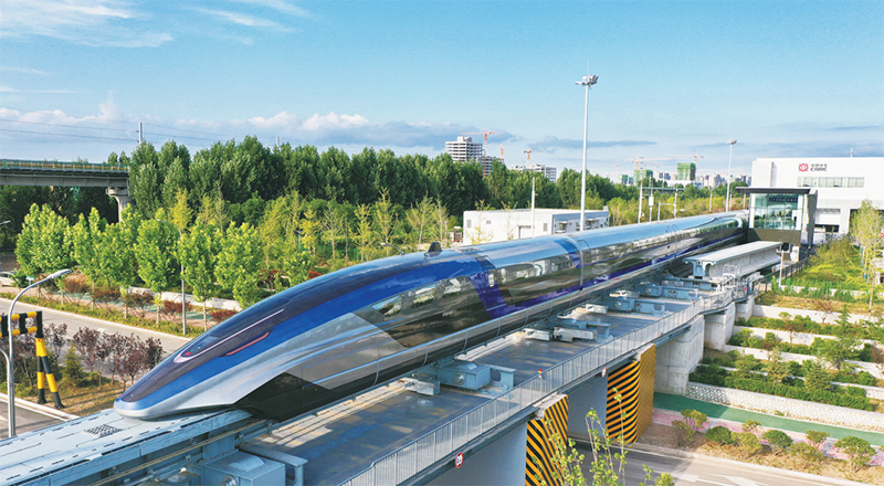 中國(guó)中車(chē)自主研制的世界首套設(shè)計(jì)時(shí)速600公里的高速磁浮交通系統(tǒng),成功攻克600公里高速磁浮交通系統(tǒng)關(guān)鍵核心技術(shù),系統(tǒng)解決了速度提升、復(fù)雜環(huán)境適應(yīng)性、核心系統(tǒng)國(guó)產(chǎn)化等難題,實(shí)現(xiàn)了系統(tǒng)集成、車(chē)輛、牽引供電、運(yùn)控通信、線路軌道等成套工程化技術(shù)的重大突破,標(biāo)志著我國(guó)掌握了高速磁浮成套技術(shù)和工程化能力。圖為時(shí)速600公里高速磁浮列車(chē)行駛在中車(chē)四方股份公司試驗(yàn)線上?!≈袊?guó)中車(chē)供圖