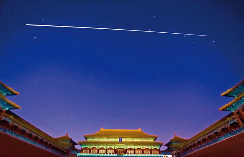 10年來,國家經(jīng)濟(jì)實(shí)力、科技實(shí)力、綜合國力躍上新臺階。圖為2021年11月19日,在北京故宮午門拍攝的中國空間站過境照片(軌跡為多張照片堆棧)。 新華社記者 邢廣利/攝