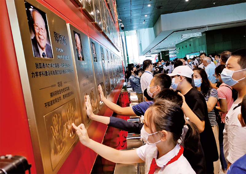2020年全國科普日期間,為弘揚(yáng)科學(xué)家精神,中國科技館與國家科學(xué)技術(shù)獎勵工作辦公室共同實施“國家最高科學(xué)技術(shù)獎獲獎科學(xué)家手模”項目,采集袁隆平、孫家棟、屠呦呦、黃旭華等國家最高科學(xué)技術(shù)獎獲獎科學(xué)家手模,并錄制寄語視頻。2022年5月,中國科技館被中國科協(xié)、教育部、科技部等7部門認(rèn)定為全國首批“科學(xué)家精神教育基地”。圖為在科學(xué)家“手模墻”前,觀眾們品讀科學(xué)家寄語并與科學(xué)家“擊掌”。 中國科技館供圖