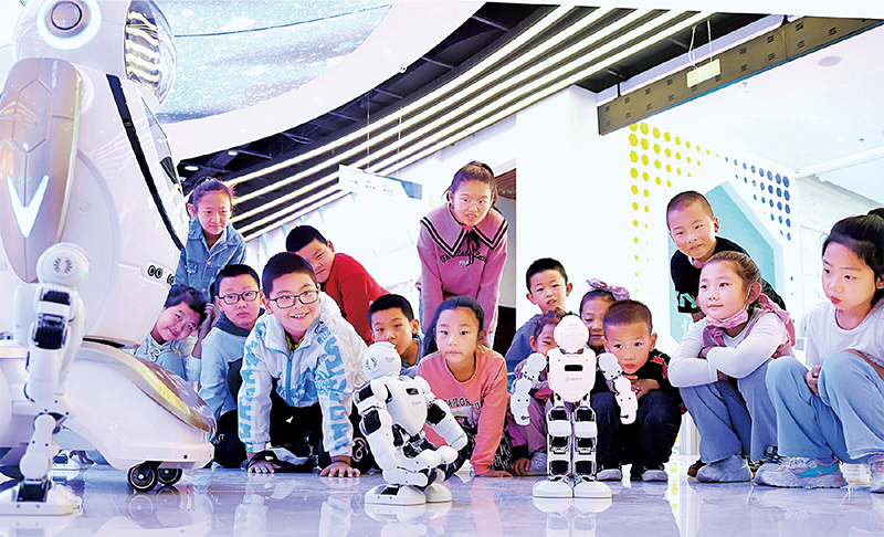 現(xiàn)代科技館體系服務(wù)范圍從城市居民為主拓展到全國城鄉(xiāng)居民、線上線下公眾,有效促進(jìn)了科學(xué)教育資源的均衡普惠。圖為2021年9月11日,甘肅省張掖市臨澤縣的小學(xué)生在張掖科技館觀看機(jī)器人表演。 求是圖片 王將/攝
