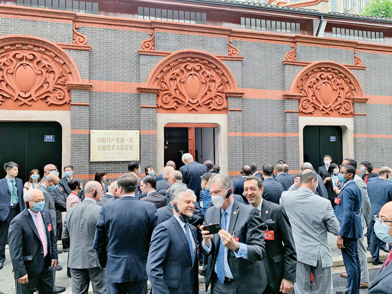 2021年6月16日,“中國共產黨的故事——習近平新時代中國特色社會主義思想在上海的實踐”特別對話會在上海舉行。近100個國家、126個政黨和友好組織的740多名代表通過視頻連線參加對話會,40多個國家駐華大使現(xiàn)場出席會議。圖為與會駐華使節(jié)參觀中共一大會址。 人民網(wǎng) 馬作鵬/攝