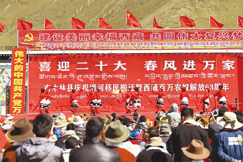 2021年7月,在西藏考察時,習(xí)近平總書記強(qiáng)調(diào)“學(xué)史力行”。圖為2022年3月28日,在日喀則市南木林縣卡孜鄉(xiāng)湘河水庫移民新村廣場,當(dāng)?shù)厮囆g(shù)團(tuán)在慶祝搬遷暨西藏百萬農(nóng)奴解放63周年活動上表演節(jié)目?!⌒氯A社記者 張汝鋒/攝