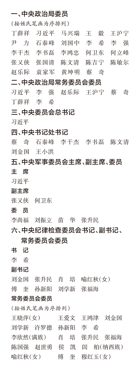 全會(huì)選舉了中央政治局委員、中央政治局常務(wù)委員會(huì)委員、中央委員會(huì)總書記;根據(jù)中央政治局常務(wù)委員會(huì)的提名,通過了中央書記處成員,決定了中央軍事委員會(huì)組成人員;批準(zhǔn)了二十屆中央紀(jì)律檢查委員會(huì)第一次全體會(huì)議選舉產(chǎn)生的書記、副書記和常務(wù)委員會(huì)委員人選。名單如下: