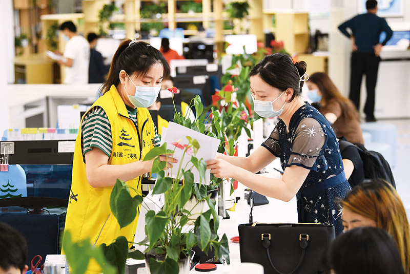 營商環(huán)境是企業(yè)生存發(fā)展的土壤。圖為2022年6月15日,貴州省貴陽市南明區(qū)政務服務大廳法人服務區(qū)的工作人員在給企業(yè)人員講解減稅降費優(yōu)惠政策?!∏笫菆D片 趙松/攝