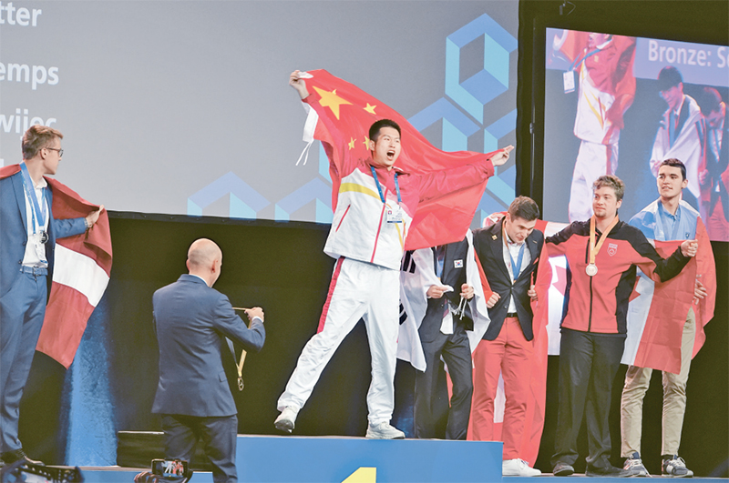 在2022年世界技能大賽特別賽奧地利賽區(qū)的比賽中,中國(guó)代表團(tuán)取得優(yōu)異成績(jī),共獲6枚金牌。圖為11月27日,在大賽中獲得重型車輛維修項(xiàng)目金牌的中國(guó)選手蔣昕樺(中)在頒獎(jiǎng)儀式上。 新華社記者 劉昕宇/攝