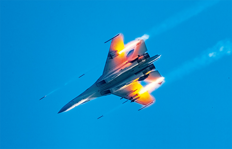 空軍某基地緊貼實(shí)戰(zhàn)組織官兵開(kāi)展多課目實(shí)戰(zhàn)化訓(xùn)練。圖為戰(zhàn)機(jī)對(duì)地面目標(biāo)實(shí)施攻擊。 解放軍畫(huà)報(bào)供圖 徐晨桐/攝