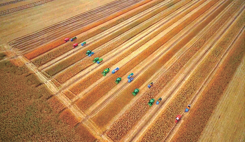 吉林省梨樹縣牢記習(xí)近平總書記“保護(hù)好黑土地這一‘耕地中的大熊貓’”的囑托,不斷增加黑土地保護(hù)利用的科技含量,不斷推進(jìn)農(nóng)業(yè)生產(chǎn)的機(jī)械化、集約化、規(guī)?;?、標(biāo)準(zhǔn)化。圖為2022年梨樹縣萬畝良田秋收美景。 吉林省委宣傳部供圖