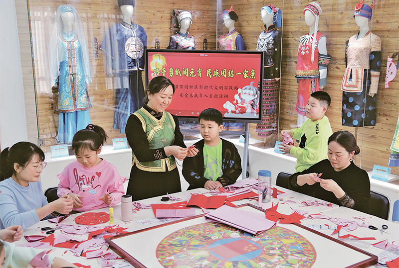 2023年2月3日,內(nèi)蒙古赤峰市松山區(qū)興安街道臨潢家園社區(qū)在民族融合小課桌開展“巧手剪紙鬧元宵”活動(dòng)。 王婷/攝