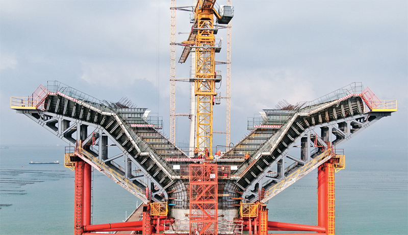 中央企業(yè)把主題教育與貫徹中央重大決策部署結(jié)合起來,切實(shí)抓好服務(wù)構(gòu)建新發(fā)展格局戰(zhàn)略任務(wù)。黃茅??绾Mǖ朗抢^港珠澳大橋、深中通道之后,粵港澳大灣區(qū)又一跨海通道工程,由保利長大承建的黃茅海大橋中塔于2023年4月18日順利封頂。圖為4月17日,工人在黃茅??绾Mǖ傈S茅海大橋進(jìn)行墩柱基樁建設(shè)。 新華社記者 鄧華/攝