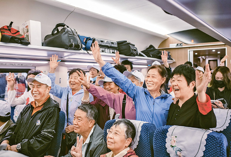 2023年4月13日,中老鐵路開(kāi)行國(guó)際旅客列車(chē),昆明至萬(wàn)象間可實(shí)現(xiàn)乘火車(chē)當(dāng)日通達(dá)。中老鐵路國(guó)際旅客列車(chē)的開(kāi)行,對(duì)于方便沿線民眾出行、推動(dòng)兩國(guó)旅游等產(chǎn)業(yè)發(fā)展,促進(jìn)兩國(guó)經(jīng)貿(mào)往來(lái)和共建“一帶一路”高質(zhì)量發(fā)展,具有十分重要的意義。圖為乘坐首發(fā)列車(chē)的旅客在車(chē)上合影留念。 新華社記者 胡超/攝