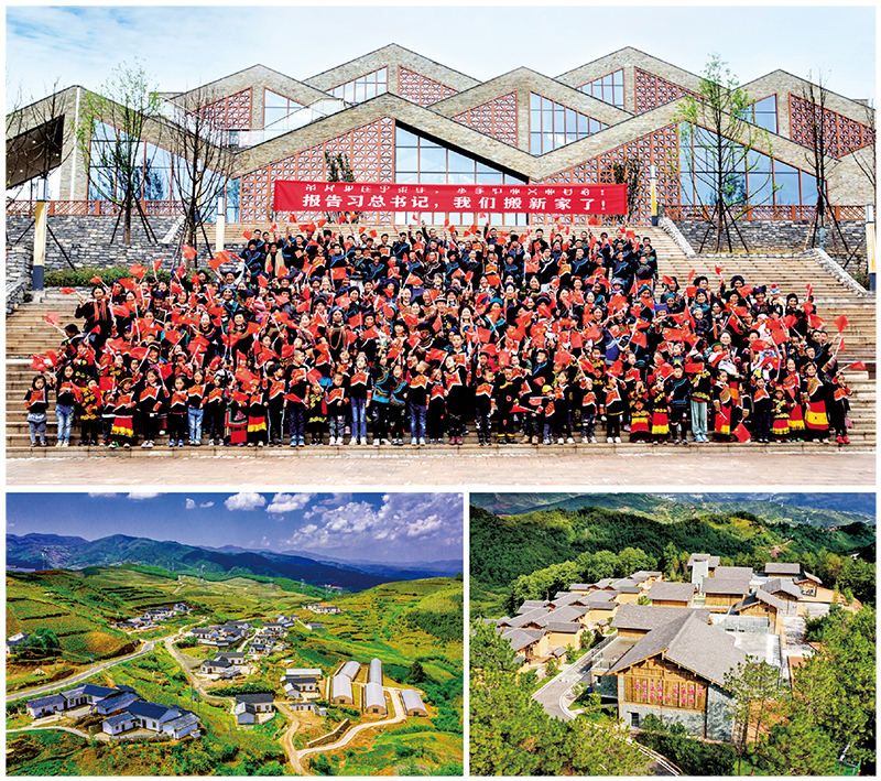 上圖為搬遷群眾在沐恩邸社區(qū)廣場合影;左下圖為火普村全貌;右下圖為三河村易地搬遷安置點新貌(拼版圖片)。 昭覺縣融媒體中心供圖