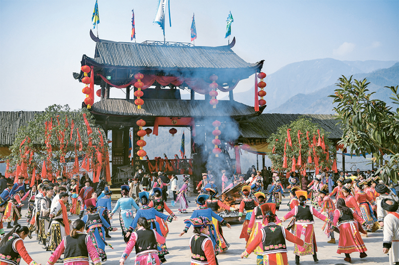 2023年1月18日,四川省北川縣石椅村村民跳起“沙朗”,歡慶新年。 C視覺供圖 楊樹/攝