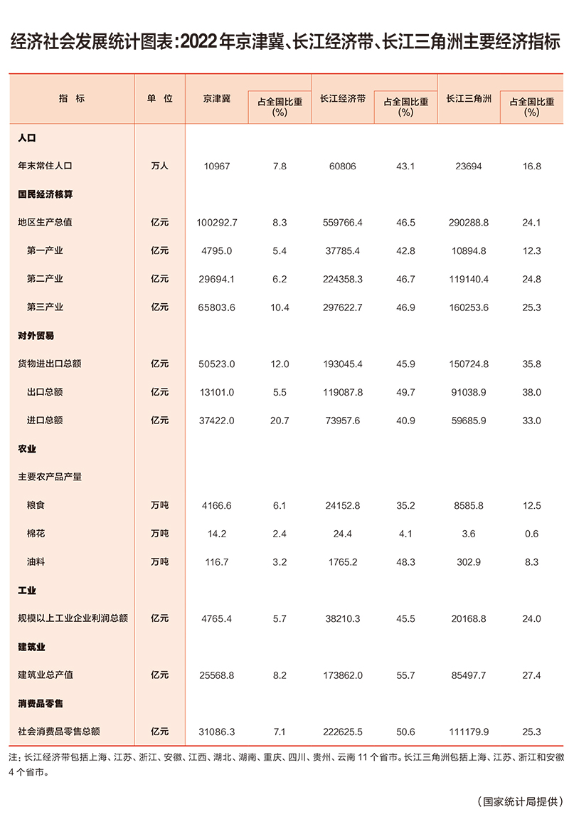 經(jīng)濟社會發(fā)展統(tǒng)計圖表:2022年京津冀、長江經(jīng)濟帶、長江三角洲主要經(jīng)濟指標
