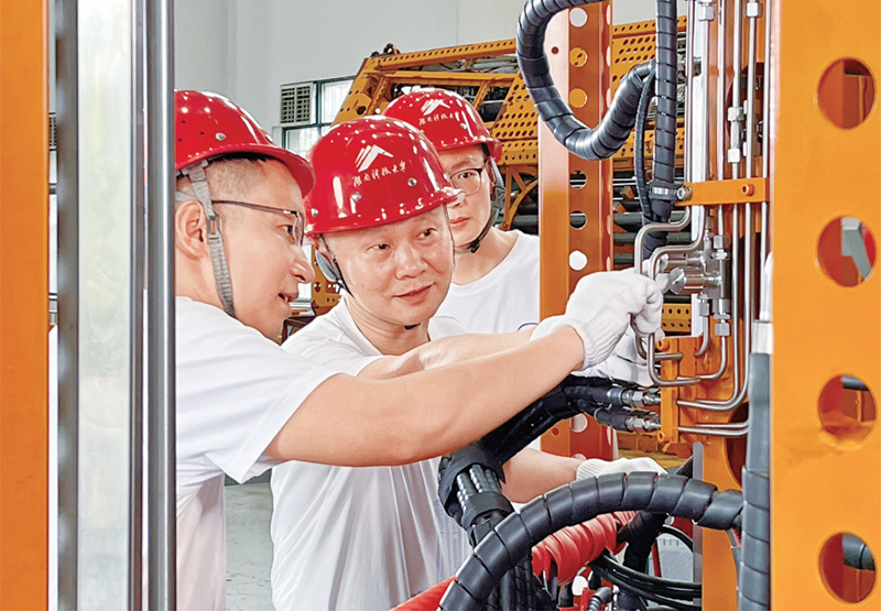 萬步炎關(guān)心和愛護(hù)青年人才,對團(tuán)隊(duì)成員關(guān)心關(guān)切、耐心指導(dǎo),毫無保留傳授自己的經(jīng)驗(yàn)和心得。圖為萬步炎(中)在給團(tuán)隊(duì)成員講解技術(shù)難點(diǎn)。 湖南省委宣傳部供圖 唐亞慧/攝
