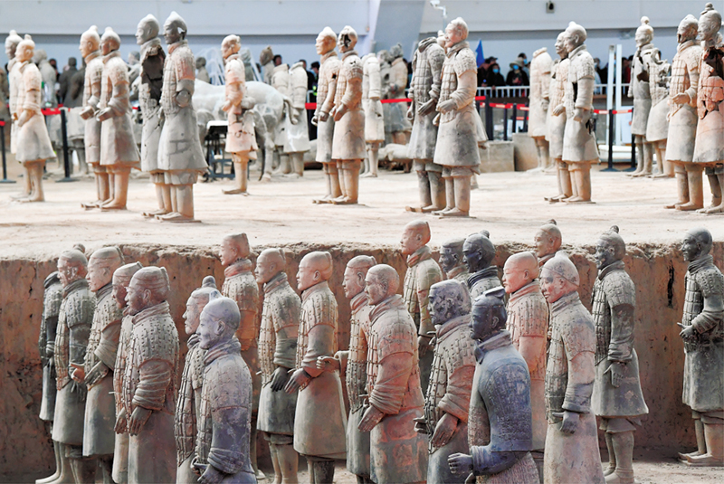 1974年,秦始皇陵兵馬俑坑的發(fā)現(xiàn)震驚世界,千人千面、生動寫實的陶俑所組成的秦始皇地下軍團撲面而來,開啟了持續(xù)至今的秦陵考古。1979年秦始皇兵馬俑博物館對外開放,兵馬俑、銅車馬等秦文明符號從此馳名中外。圖為2023年4月26日拍攝的秦兵馬俑一號坑遺址內的秦俑。 新華社記者 劉瀟/攝