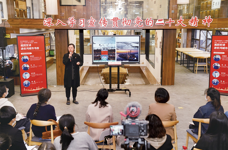 2022年11月18日,浙江省“六學(xué)六進(jìn)六爭(zhēng)先”巡回宣講團(tuán)走進(jìn)桐鄉(xiāng)市開(kāi)發(fā)區(qū)(高橋街道)伯鴻城市書(shū)房,以沙龍?jiān)L談的形式,向群眾宣傳黨的二十大精神。 桐鄉(xiāng)市委宣傳部供圖