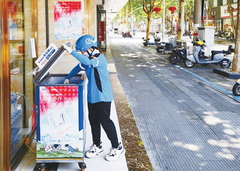 2023年8月7日,一名外賣(mài)員在浙江省桐鄉(xiāng)市街頭的“愛(ài)心冰柜”取水。在桐鄉(xiāng)市,“一杯水”公益接力已持續(xù)5年,越來(lái)越多的商家、市民踴躍加入,為戶(hù)外工作者送去愛(ài)心。 桐鄉(xiāng)市委宣傳部供圖
