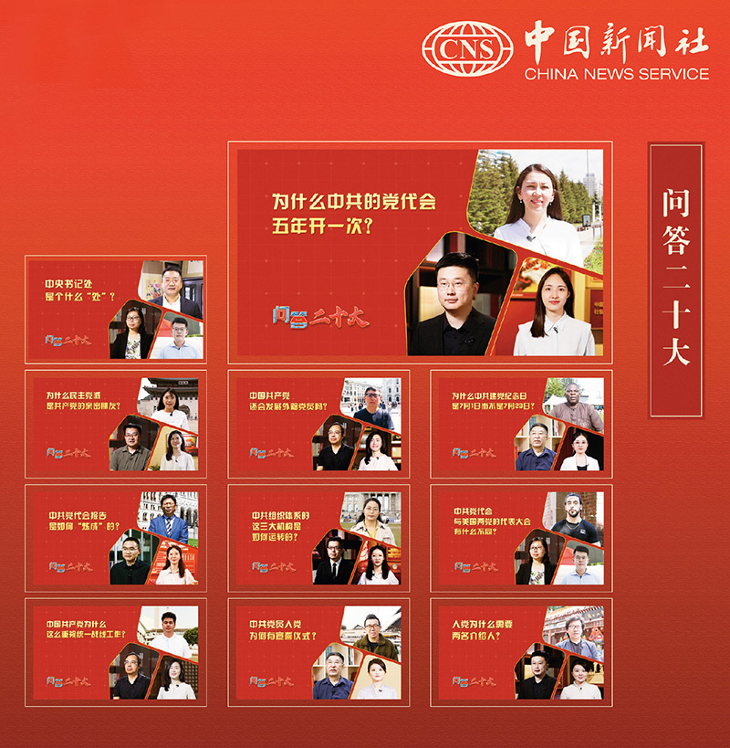 黨的二十大召開前夕,中國新聞社聚焦海外關注,運用融合形式,依托全球渠道,推出“問答二十大”系列短視頻。該系列以聯通中外為定位,以立足海外為特色,問題征集于海外,產品落地于海外,實現“問題從海外來,答案到海外去”的有效國際傳播。圖為“問答二十大”系列短視頻產品。 中國新聞社供圖