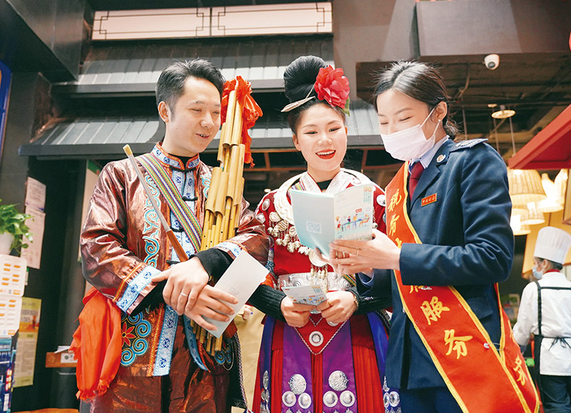 今年以來(lái),稅務(wù)部門優(yōu)化實(shí)施小規(guī)模納稅人減征增值稅、小微企業(yè)和個(gè)體工商戶減征所得稅等一批覆蓋面更廣的政策,突出對(duì)小微企業(yè)、個(gè)體工商戶的支持。圖為2023年3月16日,國(guó)家稅務(wù)總局貴陽(yáng)市南明區(qū)稅務(wù)局干部走進(jìn)當(dāng)?shù)貒?guó)家非遺項(xiàng)目酸湯魚餐飲店,講解稅收優(yōu)惠政策。 國(guó)家稅務(wù)總局供圖 梁詩(shī)茂/攝