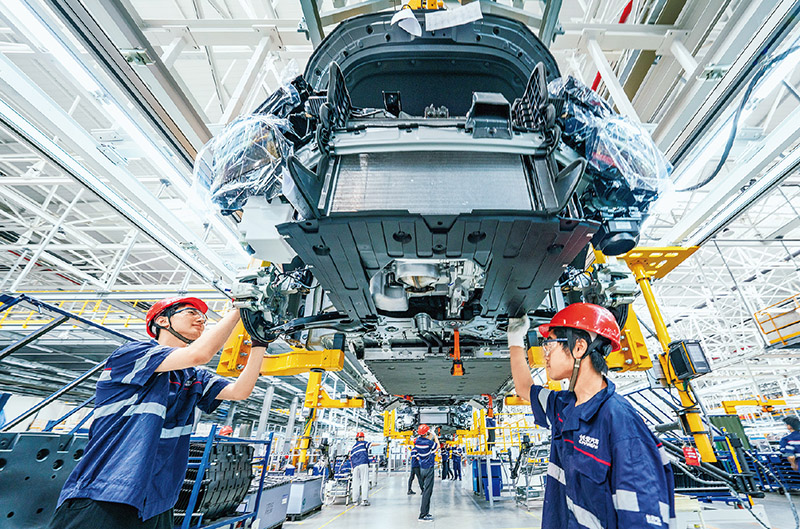 根據(jù)黨中央、國(guó)務(wù)院統(tǒng)一部署,我國(guó)新能源汽車車輛購(gòu)置稅減免政策將延長(zhǎng)至2027年底。圖為2023年8月18日,位于江蘇南京市溧水區(qū)的南京長(zhǎng)安汽車新工廠,工人們正在組裝全新長(zhǎng)安新能源SUV,一輛輛新車迅速完成組裝、下線,生產(chǎn)氛圍火熱。 人民圖片 朱紅生/攝