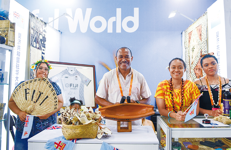 2023服貿(mào)會(huì)上舉辦“一帶一路”共建國(guó)家特色文化展示活動(dòng),通過特色文藝演出、文化推介、護(hù)照打卡等一系列活動(dòng),展現(xiàn)共建國(guó)家文化風(fēng)采。圖為展示活動(dòng)上,斐濟(jì)共和國(guó)駐華大使館展區(qū)的工作人員展示特色樂器。 新華社記者 鞠煥宗/攝