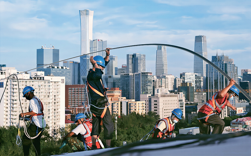 圖為2022年7月18日,在北京工人體育場(chǎng)改造復(fù)建工程的頂棚上,工人在太陽的余暉下作業(yè)。 工人日?qǐng)?bào)記者 吳凡/攝