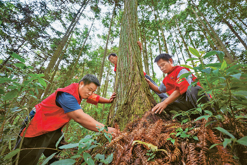 2023年8月15日是首個(gè)全國生態(tài)日,各地開展活動(dòng)提高人們生態(tài)文明意識(shí),增強(qiáng)保護(hù)環(huán)境的自覺性。圖為全國生態(tài)日當(dāng)天,護(hù)林員和志愿者在貴州省黔東南苗族侗族自治州丹寨縣排調(diào)鎮(zhèn)宰宿村巡查山林。 新華社發(fā) 楊武魁/攝