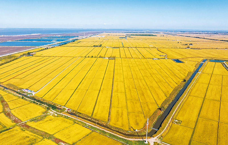 圖為2023年9月20日,遼寧省盤錦市紅海灘國家水稻公園稻田一片金黃,一派豐收景象。 中新社發(fā) 韓加君/攝