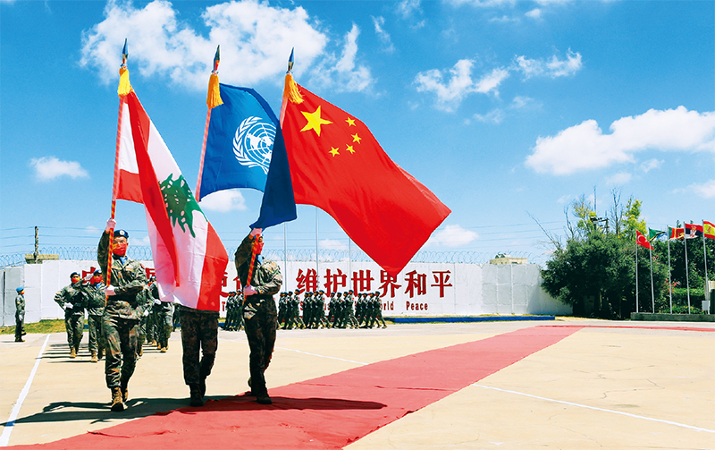 隨著全球安全倡議等中國方案得到越來越多認(rèn)同,構(gòu)建人類命運(yùn)共同體成為越來越多國家的共識(shí)。2022年7月1日,聯(lián)合國駐黎巴嫩臨時(shí)部隊(duì)(聯(lián)黎部隊(duì))授予中國第20批赴黎巴嫩維和部隊(duì)全體410名官兵聯(lián)合國“和平勛章”,以表彰他們?yōu)槔璋湍勰喜康貐^(qū)和平穩(wěn)定作出的突出貢獻(xiàn)。圖為在黎巴嫩南部辛尼亞村的中國維和部隊(duì)營區(qū),中國維和部隊(duì)官兵在受勛后通過觀禮臺(tái)。 新華社記者 劉宗亞/攝