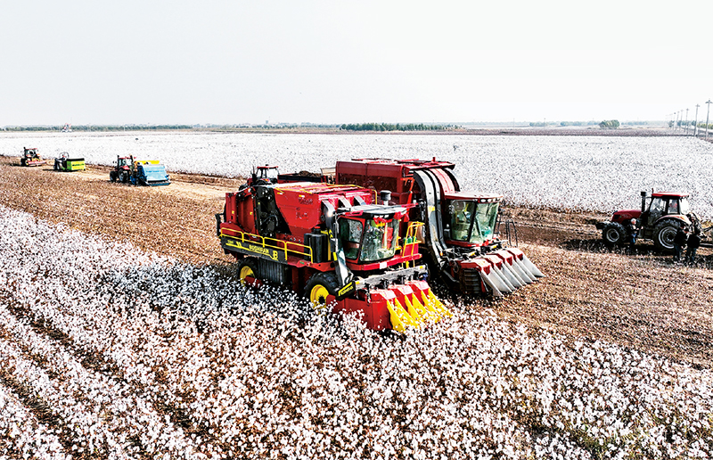 山東省濱州市無棣縣地處黃河三角洲棉區(qū)中心,可利用鹽堿耕地資源豐富,植棉歷史悠久,常年植棉面積穩(wěn)定在10萬畝左右。圖為2023年10月22日,棉農(nóng)駕駛機(jī)械在無棣縣西小王鎮(zhèn)國(guó)家級(jí)棉花生產(chǎn)基地核心示范區(qū)內(nèi)進(jìn)行采棉作業(yè)(無人機(jī)照片)。 新華社記者 朱崢/攝