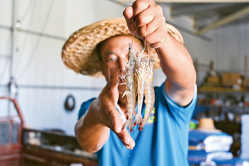 地處黃河岸邊的內(nèi)蒙古烏海市海南區(qū)巴音陶亥鎮(zhèn),因地制宜利用鹽堿地開展農(nóng)業(yè)養(yǎng)殖,不僅提高了鹽堿地的利用率,也帶動(dòng)當(dāng)?shù)卮迕裰赂?。圖為養(yǎng)殖園區(qū)工作人員展示養(yǎng)殖的對(duì)蝦。 新華社記者 劉磊/攝